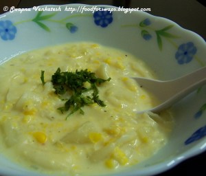 What is it about the color yellow that makes us think of summer and feel happy at the same time? Perfect for a dreary winter night, this chowder has loads of yellow in it! Corn, cheese, potatoes and cream. When you finally eat it, the happiness of the yellow gets transferred onto your face in the form of a content smile. Chowder is a thick soup, usually milk based, made with seafood, fish, vegetables or chicken. The name comes from the French chaudiere, a copper pot in which fishermen’s wives cooked a communal soup from a share of each man’s catch to celebrate the safe return of the fishing fleet from the sea. OK, so this recipe does not have fish but the story does make you feel all warm and benevolent, just like this soup!