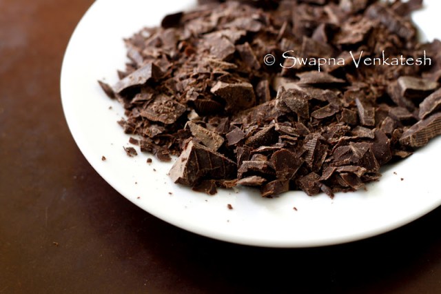 For the Ganache: Place the chopped chocolate in a medium sized stainless steel, or heatproof bowl. ( I use dark chocolate with less than 54% cocoa solids because the higher % ones tend to split while whisking.) Set aside.