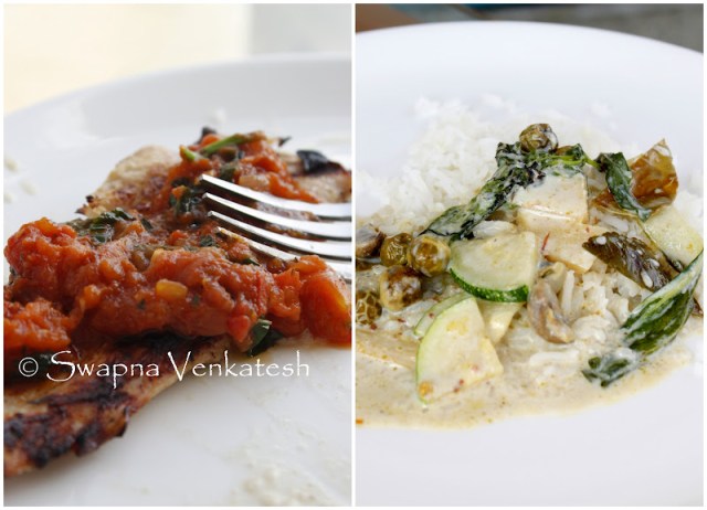 (Coal Smoked Chicken Breast with Pomodoro Basilica Sauce and Thai Green Curry with Steamed Rice)