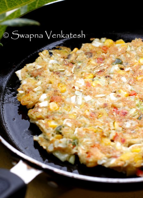 Now check on the pancake to see if the underside is almost cooked. (light brown colour). Using a fish spatuala and another wooden one, turn it over. If you have got the consistency of the batter right, this part should be a piece of cake. Another way to flip it over, is to loosen the edges of the pancake from the pan, then overturn the pancake onto a large plate. Then slide the pancake back onto the pan. (I think the uncooked side will stick to the plate – but that’s the technique some people use!) Cook the other side for 7-8 mins as well.