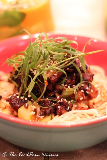 I walked in to a familiar setting. Friends, food and getting wasted on drinks in the afternoon. It was the same this time. Like a warm blanket, familiarity can be comforting. There was a blackboard menu. Some new items of interest had made their way up there. A Beef and Jalapeno Potsticker, even a Salmon Khan! Should I shake things up a bit? The guy in the red t-shirt said yes. But of course he would… he worked there. So I tried it. Nice, but it wasn’t my warm blanket. I stirred my Mandarin Caprioska and told him I was shaken. I need to settle into my grove again. I ordered the Bork. The pork was double cooked till he turned black. From that point on, he was called Bork. I gently removed the spring onion frills that he had chosen to be dressed with. Sesame seeds stuck to him like thick friends. No matter, the more the merrier. I cut into the Bork, gently lifted a piece into my mouth. The meat was crispy and the fat was soft. I followed it up with a mouthful of vegetables and noodles tossed in Black Bean sauce. The hit of Chili Oil was unmistakable. So the Bork liked his noodles hot…well, so did I.