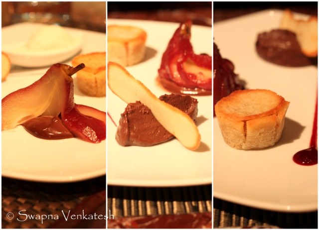 Finally the desserts arrived. Tasting portions of four. (Yipee!). For obvious reasons there was no Tiramisu because the chef had decided to enthrall us with more exotic combinations. Double Chocolate and Mascarpone Cheese Mousse with hazelnut biscuit, Red Wine Poached Pear (got it right again!) with double cream, Apple Charlotte and Vanilla Ice cream. Vanilla Ice Cream?… Ho Hum. I decided not to eat that till I sampled the rest. After polishing off the mousse, I attacked the apple charlotte and realized it need something creamy. Ok, Vanilla Ice cream you get your turn. But..surprise surpirse …this was a Parmesan Cheese Ice Cream. I am telling you it was insane! Insanely Brilliant. The flavor of the cheese is unmistakable and though it seems savoury, it was a wonderful way to end a fabulous Italian meal!