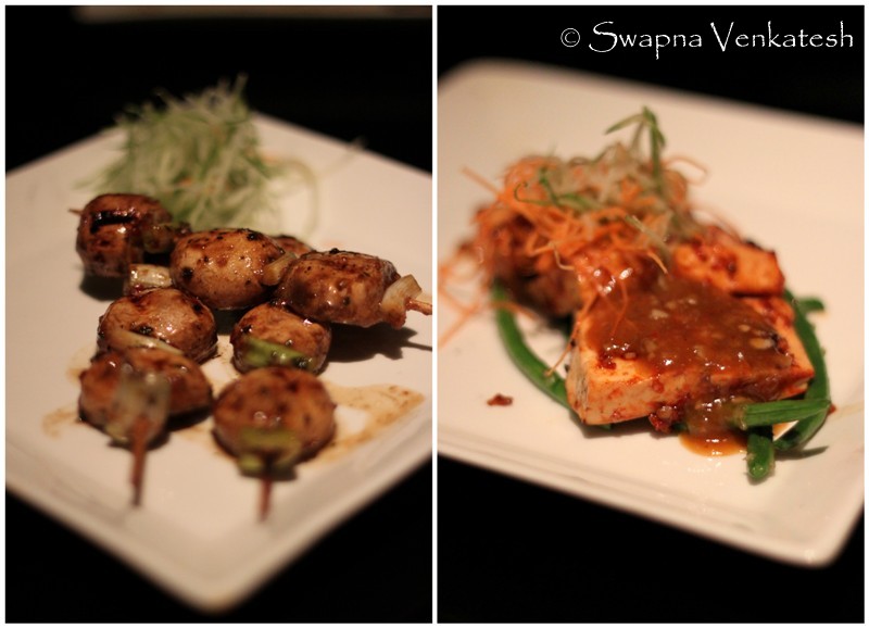 (L-R: Grilled Mushroom Skewers, Pan Seared Tofu with Indonesian Ginger Sauce)