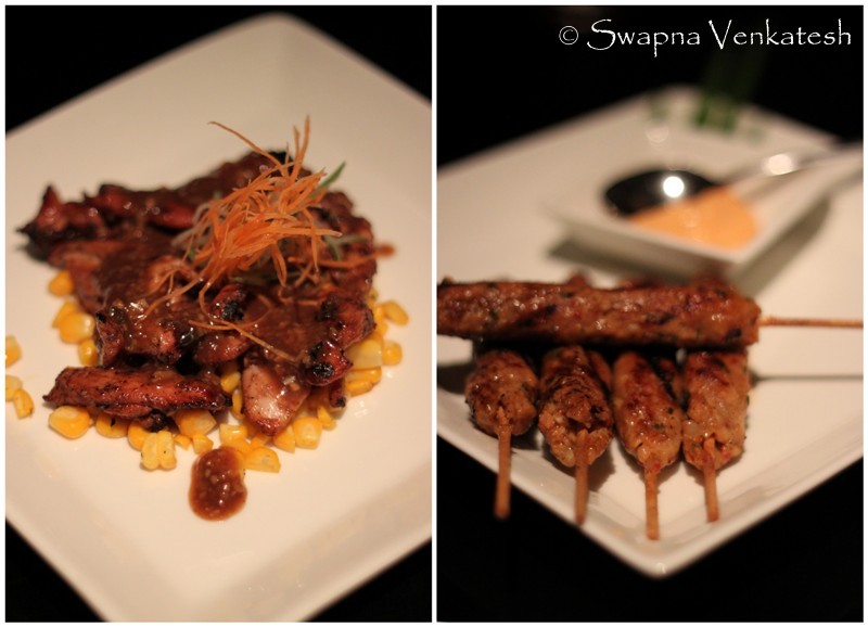 From the vegetarian section we opted for the Grilled Mushroom skewers, Thai Curry Babycorn skewers and the Pan seared Tofu with Indonesian Ginger Sauce. The mushrooms were divine. Plump, juicy and the marinade just clinging on to them. I generally wouldn’t order veggies, but I might make an exception for this one. (Maybe it’s because mushrooms have maximum Umami – a naturally occurring ajinomoto that enhances taste!) The Babycorn skewers were ok and I really can’t say anymore about them. The Tofu served with crunchy green beans was interesting and could easily be a light main course.