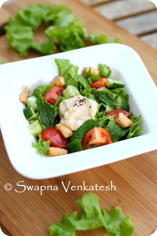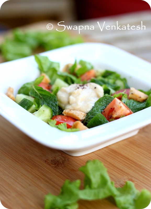 The first time I ate Fattoush, I didn’t pay much attention to it. It was my accompaniment to the more interesting Shawarma. And in the Bangalore of 2000, a Shawarma with all its trimmings was very very exotic. A vertical spit roaster filled with chicken slices rotating ever so slowly, while the chef toasted and filled the strange yeasty bread with Hummus, Tahini, salad and finally the sliced chicken – was a demonstration I thought was fit to bunk classes for. But slowly, ever so slowly, the Fattoush has established a firm place in my heart and I actually forgo the shawarma for just fattoush-hummus these days! So what exactly is the Fattoush? For those of you who have seen ‘Meet the Zohan’ – it’s Zohan’s arch nemisis Phantom’s real name! And for those who have better things to do than indulge in trivial pursuits – it’s a salad. A Lebanese Bread Salad that chefs in the earlier days made as an excuse, to use up stale pita bread. (Ok, no one uses stale bread anymore – just toasted crisps work just fine!) So why am I acting all Alice in Wonderlandy about an ex-stale bread salad? Because fattoush hummus is my comfort baby. My tummy actually asks for this on a regular basis. Coupled with the hummus and the pita crisps, it’s actually a complete meal – One that will leave you feeling healthy and satiated. (No… KFC doesn’t do that!)