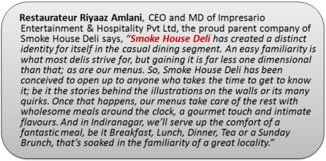I loved the SHD experience. Can’t wait to go there for Breakfast, Lunch and Dinner. Maybe for tea sometime in the evening as well – they are open all day! Welcome to Bangalore Smoke House Deli – I expect fantastic things from you …don’t let me down!