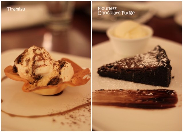 My spare stomach for dessert was putting on it’s party shoes. There was a heated debate on the Tiramisu being mildly under the radar on the coffee flavor. Since I don’t much care for coffee at all, this didn’t affect me. The flourless Chocolate fudge was brilliant. Being a chocolate dish, it got polished off the plate in a jiffy.