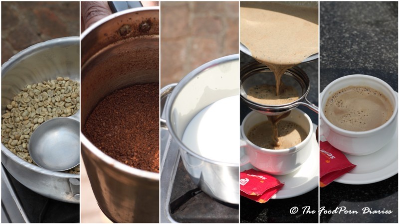 Long story short – beans are plucked, washed, de-pulped and dried (they look pale green). The they are roasted for half hour till they turn a nice chocolatey brown. (you’ve seen this in stores). Then the beans are ground to get coffee powder (ah! The aroma). The Coffee powder is then mixed with Chicory (the bark of a tree) to give it the characteristic strong, bitter taste that Indians love. (Most countries just like their coffee pure and unblended). The final step is to heat milk and then add the blended coffee powder in and strain into a cup. Add sugar if you please and enjoy! (P.S. this cuppa was one of the best I’ve ever tasted … and quite frankly liked!)