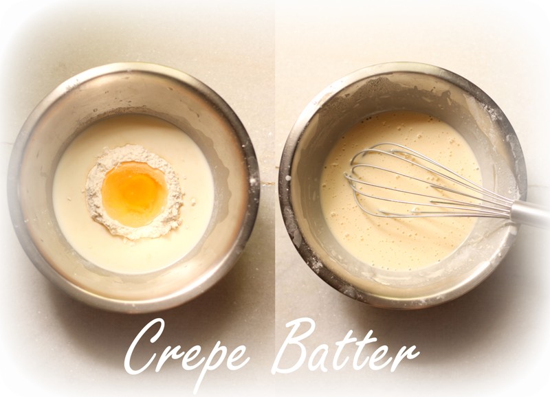 Heat a heavy 9 inch frying pan and grease it with some butter. (Keep the heat med-low). Pour 1/6 th of the batter in it. Tilt the pan to move the batter around so that it covers the entire base. Cook till it is golden and the sides of the crepe start rising. Now flip it over and cook the other side as well. Set aside. Repeat the process to get 6 crepes.