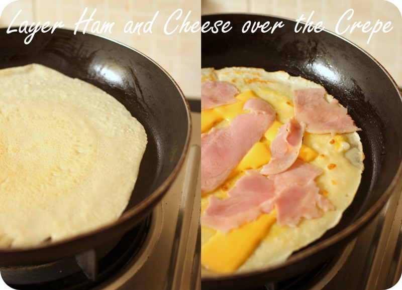 Keep your beaten egg, ham and cheese ready. Reduce the heat of the frying pan to low. Lay a crepe on the pan. Spread 2-3 spoons of the beaten egg on the crepe. Lay out the cheese on top. (Restrict it to one half of the crepe). Now lay the ham over it. (You can season it at this point with some pepper. Avoid salt as the cheese and ham already have salt in them). Fold the crepe in half, over the ham and cheese. Now fold it again to make a wedge. Gently heat through till the cheese is melts. Now transfer it to a warm serving plate and sink into a decadent breakfast.