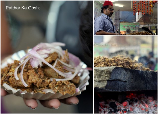 I was happy to see the coals glowing red hot and the big block of granite on top hissing and sizzling, when the marinated meat touched it. It meant that the Patthar ka Gosht was ready for our greedy bellies. Patthar ka Gosht, essentially means meat cooked on a rock. (In this case the meat is Veal, or should I be more appropriate and call it ‘Wheel’ kebab). They place a big block of granite over some red hot coals and slowly heat it up. (It apparently takes a good 3-4 hours). Then they cook the meat on the stone. This is supposed to sear the meat well and impart an earthy flavor. How much of this is true I can never tell, but this dish always draws huge crowds during Ramazan. This year there were many stalls that jumped onto the sizzling granite bandwagon, but the original one and the one that I like the most, is the guy next to the Kebabish stall. He always wears a red topi, so it’s easy to recognize him.
