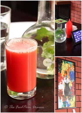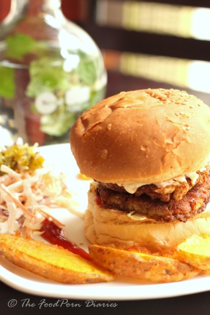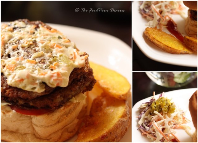 I ordered the juice of the day to keep me company and Watermelon it was. Sweet, not cloyingly so and immensely satisfying! Though the mint leaf infused chilled water goblet at every table would have been perfect too. A lovely touch, especially because I have felt obliged to order for a bottle of water in other restaurants because the water offered looked suspect! Another thing that was bought to my notice was that everything from the mayonnaise to the baked beans to the bread and even the ketchup on the table, was made in-house. This took it up a notch in my book but there will be issues of standardization and consistency that they may have to keep a close eye on, in the future.Apart from the Breakfast offerings a recent addition to the menu has been their Burgers. Gaining a steady fan following, the burgers are probably what will give them the most traction. The creative name calling continues with ‘The Hot Chick’ (Pulled Chicken Burger), ‘Mary had a little Lamb (the lamb burger) and the Jumping Jhapang (a desi twist to the meat burger). I settled on a Fried Nemo – A fish burger. It was made with basa and not the real Nemo, so stop frowning! Two fish fillets deep fried and served with home made tartar sauce, onions, tomatoes and a slice of Lettuce cabbage. The addition of cabbage was apparently a conscious decision as it stays crisp till the end and most of their clients prefer it that way. The home-made Burger bun was soft and did not cave with the weight of the fillings, so rest assured Nemo will be safe within its folds! All burgers come with cole slaw and potato wedges. A special mention to the perfectly crisp on the outside, soft on the inside Potato wedges!
