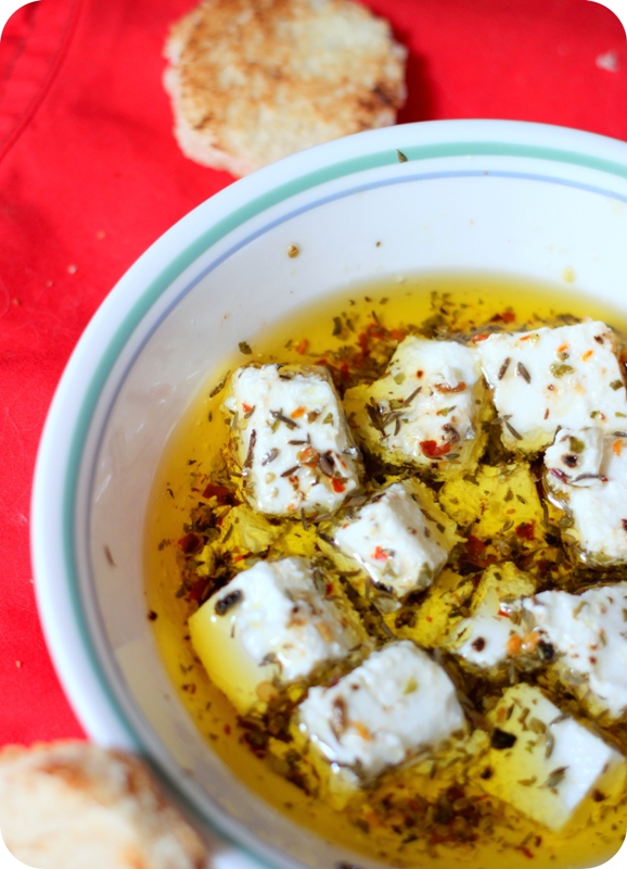 Dry roast the herbs, pepper and chilli flakes in a hot pan for 2 mins. (This helps release the aromatic oils). Alternatively you can just heat the herbs in the microwave for 30 secs. Now pour the olive oil onto the herbs and warm through in the microwave for 30 secs. Place the cubed Feta, in a small shallow bowl, Now pour the oil and herb mixture over the Feta. Use a very light hand to ensure all the cubes are well marinated. Add some more oil here if necessary. Serve with Pita (I like mine toasted) and some olives. Prepare to be crowned Queen (or King) of Chic Appetizers.
