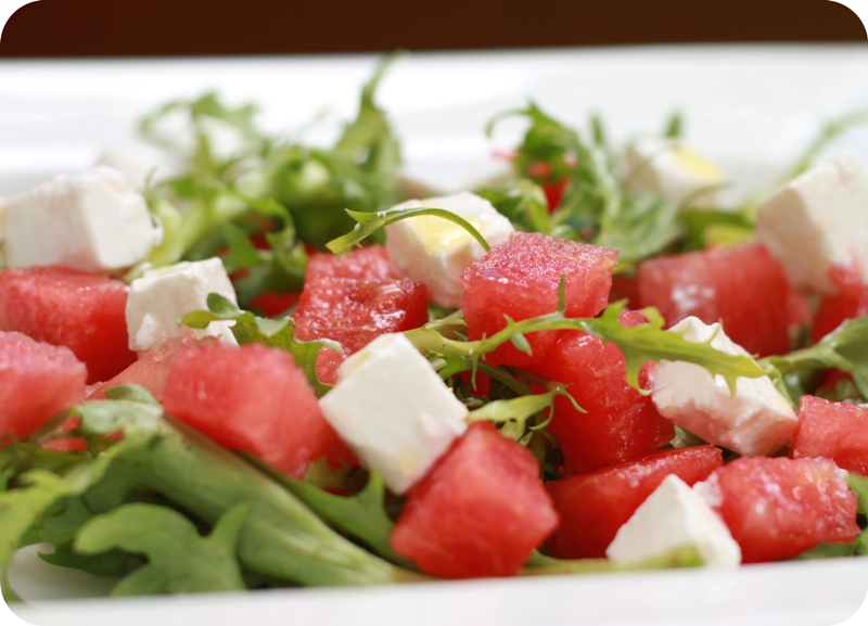 Feta is a brined soft cheese, made from sheep (and goats milk) and is very popular in Greek cuisine. It looks like paneer but is much softer, grainier and tangier. While the most popular way of using feta is in a Greek Salad – this cheese has the ability to shine in many other dishes. I picked up a slab of Feta this week and was hard pressed to find a recipe that does it justice. I wanted Feta to be the star of the dish and not just a supporting element. After many frustrating hours of searching my recipe books and the internet, I just decided to use it in a Watermelon and Arugula (Rocket) Salad. Besides, I had recently learnt how to deseed a watermelon and I was itching to see if it works. (It does – Instructables shows you how!). The salad is an amazing medley of tastes and textures – sweet and crispy watermelon, crunchy and peppery arugula and finally creamy and salty feta, dressed with silky honey and olive oil. The salad is super easy to put together and colorful to look at as well. I used up half the slab of feta here and packed the other half away.