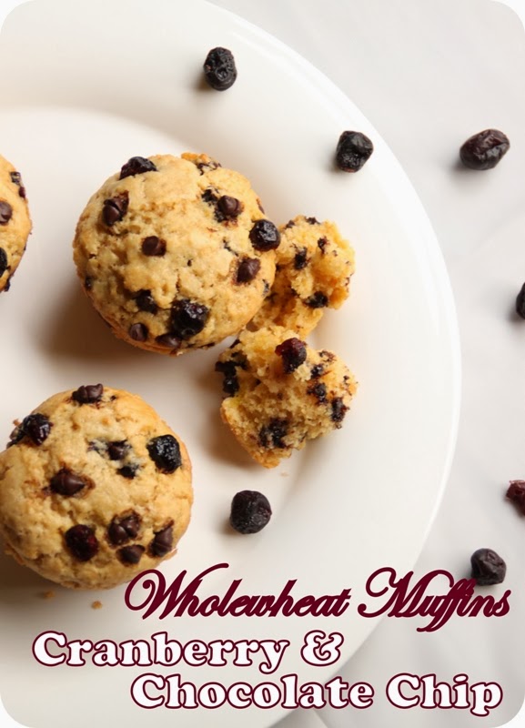 The idea was to keep them at my work desk and have them as a snack, a-la-Oprah. But the recipe books beckoned and I caved. A whole wheat muffin that called for dried cranberries had my name written all over it! I improvised and added some chocolate chips in as well…Who knew they would hit it off? 🙂