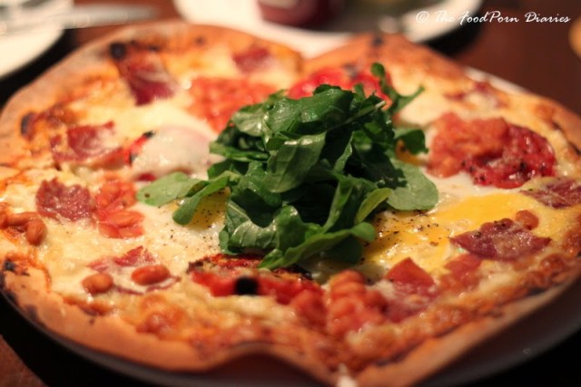 This one deserves a special mention. It’s not Irish, it’s not Indian, it’s not Italian. What it is, is a full English Breakfast on a thin crust Pizza. Think baked beans, a sunny side up egg, tomatoes and bacon! Once the novelty wears off, you will definitely appreciate the skill that goes into baking a pizza with an egg on top that still has a runny yolk! It’s the convenient way of having breakfast and it strangely tastes brilliant.