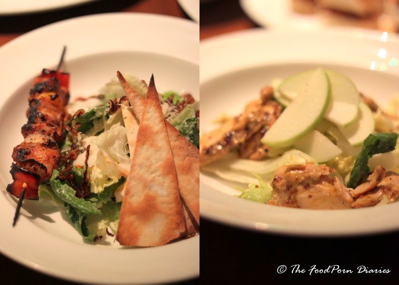 We were served two salads – Ceaser Salad with a twist. The twist being the croutons were replaced with crisp Pita/ naan, there were crispy fried onions on top and there was a skewer of grilled chicken on the side. Did not work! Though the elements of the Ceaser salad were there – parmesan, romaine lettuce, eggs, lemon and olive oil – the grilled chicken skewers overshadowed the salad and reduced it to an accompaniment. Maybe if they just called it a Grilled Chicken Salad, I would have been more forgiving. Thankfully the Green Apple and Chicken Salad with a honey mustard dressing redeemed Ceasers confusion.