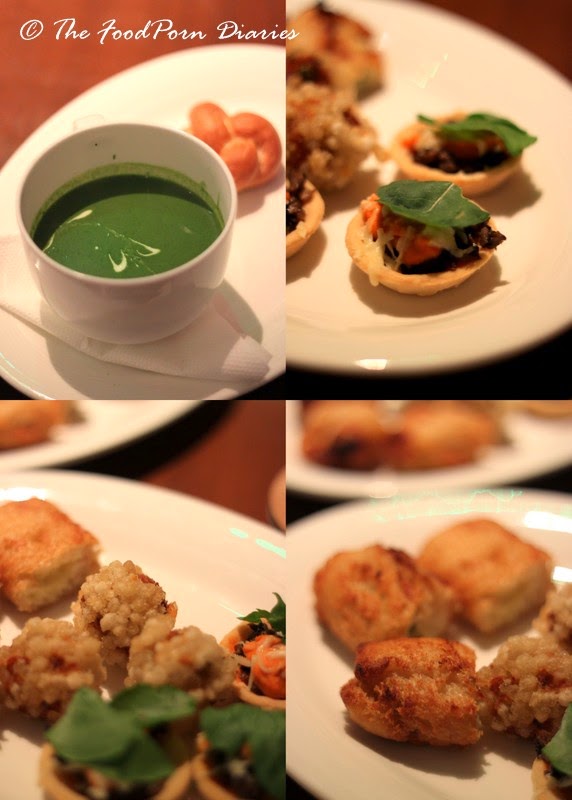 A trio of veg platter arrived to keep my martini some company. The Sago alla Verde was a fancy term for a deep fried vegetable and sago ball. Irish? Definitely no. When I quickly glanced through the menu, I realized that though they have Irish food, they weave in other favorites to keep the crowd happy. So tonight was going to be a jugalbandi of Irish, Italian and Indian flavors and I hoped and prayed they get it right! The Cheesy Potato Log sounded Irish enough and had enough of both to nudge me to take another bite. If you break it down, its cheesy bread rolls and though tasty, I wouldn’t call it inspired. The Nutty Mushroom Tart on the other hand was perfect. A buttery, crumbly pastry shell which held a lovely mushroom, vegetable and nut filling and garnished with arugula. Maybe next time, I’ll ditch the trio and just get the one tart (Yes, it’s an innuendo. Sue me 😉 The Spinach and Corn Soup was green and creamy. I would say it was well executed but the flavor reminded me of Palak Paneer. Once the thought entered my mind, I couldn’t shake it off and hence the soup was pushed aside to make room for less offending appetizers.
