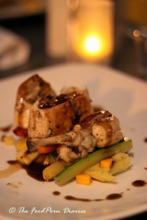 Raw mangoes – tangy, crunchy and a whole lot of fun. Asian cooking uses this in a lot of salads including the famous ‘Thai raw mango and papaya salad’ and the next offering seemed to take inspiration from there. We were served a Shrimp and Raw Mango salad with a soy chilli dressing. The shrimp was perfectly cooked and the salad was beautifully plated, but…..the dressing was hardly discernable. I requested for some extra dressing on the side and that seemed to do the trick. The dressing itself was a fabulous soy, peanut paste and chilli combination and I wondered why the chef had been miserly with it in the first place.