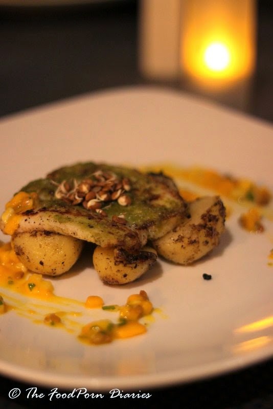 Raw mangoes – tangy, crunchy and a whole lot of fun. Asian cooking uses this in a lot of salads including the famous ‘Thai raw mango and papaya salad’ and the next offering seemed to take inspiration from there. We were served a Shrimp and Raw Mango salad with a soy chilli dressing. The shrimp was perfectly cooked and the salad was beautifully plated, but…..the dressing was hardly discernable. I requested for some extra dressing on the side and that seemed to do the trick. The dressing itself was a fabulous soy, peanut paste and chilli combination and I wondered why the chef had been miserly with it in the first place.