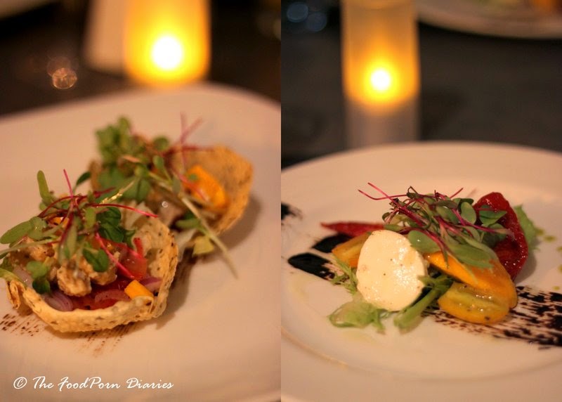 I was looking forward to the Mini Mango Poppadums’. The vegetarian option included falafel, mango and tzatziki while the non-vegetarian option included smoked chicken and mango. Both poppadums’ were dressed with micro greens and extra virgin olive oil. I preferred the vegetarian falafel version to the chicken. Somehow the texture of the fried falafel complimented the soft mango slices a lot more than the soft chicken. We all thought the salad as well as the poppadums’ could have used a little more seasoning to bring alive the flavors.