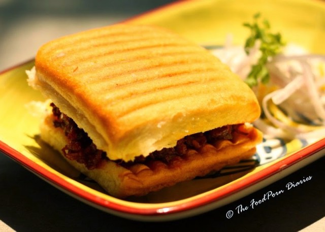 At some point I remember one of us considering the Gastro Burger and the Seafood Sliders, (both of which are exceptional by the way – I’ve tried them on an earlier occasion) but today we had a rather porky bent of mind and settled for the BBQ shredded Pork Sloppy Joe and the Pork Belly Sliders. The Pork belly at LikeThatOnly was probably my husband’s one true love. Now that LTO has downed its shutters, I have reclaimed that position. Oh wait, there’s still football…Drat! So I ordered this one to test its capacity for destruction. Succulent twice cooked Pork Belly, crispy and soft at the same time – served with grilled scallions, basil and chilli mayo. The Asian twist to the Pork belly is the only way I like it and basil provides the hint of freshness that tricks you into forgetting that you are essentially eating layers of pure fat. This one is a killer!