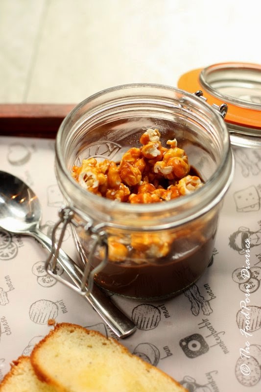 Now the Chocolate Pot De Crème with Salted Caramel, sounds anything but prosaic. It comes in a jar with a lid, which makes the experience of eating it all the more fun. More fun because I can shut the lid whenever I don’t feeling like sharing (the lemon cake needs one!). Gooey, rich Chocolate Mousse and salted caramel topped with caramel popcorn. The mousse is luscious but what elevates it, is the friggin popcorn! How they managed to get the caramel so damn right is beyond me. (Please tell the pastry chef I’ll buy the movie tickets, if he/she gets me a bucket of that amazing caramel popcorn!).