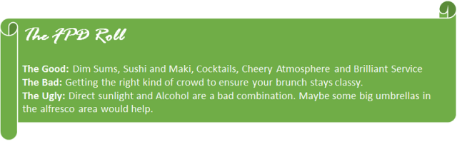Sunday brunches are sure shot ways of letting all your diet plans go down the drain, or in this case go down a flute of champagne. Over indulgence aside, the sheer variety of cuisines laid out like a smorgasbord of sin is enough to send my head reeling. And with zero will power when it comes to the amount of food I consume – I’m walking on dangerous territory. So getting to HIGH Ultra Lounge for their Sunday Brunch was guided by two important aspects – a. They focus on just Asian fare which is definitely lighter than our ghee laden kormas and b. The absolutely fabulous cocktails their main man Guru dishes out. What’s a Sunday brunch without some tipple eh?