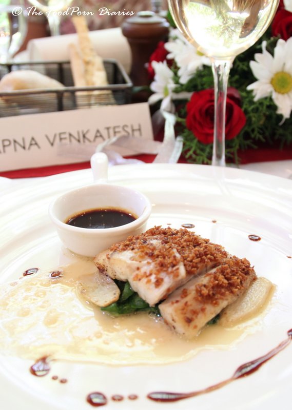 Shallot crusted wild Cochin – Bay sea bass, Salsify , wilted spinach, ‘Soubise’ red wine reduction
