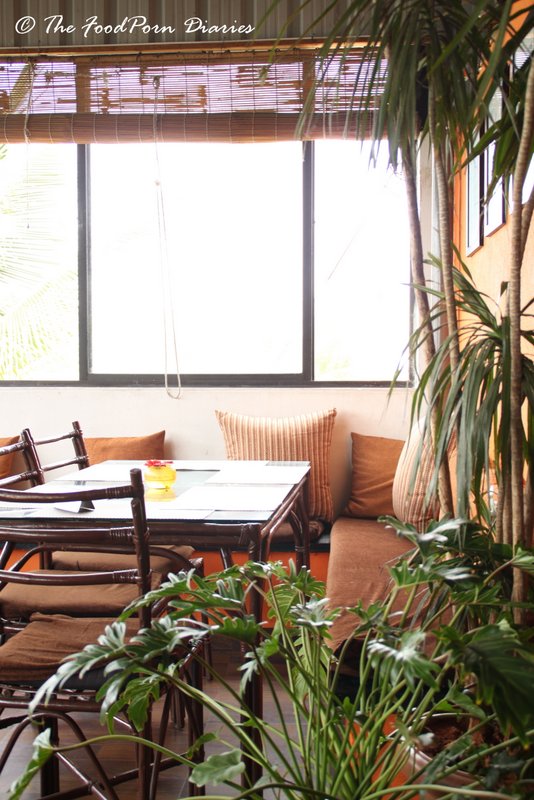The Café is located on the terrace of the Goethe Institut. The building is as German as minimalist design goes – clean, cubist and functional. What lends it loads of character is the graffiti painted on the boundary wall and garage, and the beautiful Gulmohar trees flanking the structure. The wait for the lift ride to the café is worth it, to avoid the huffing and puffing that comes with a stair climbing exercise. If you arrive there in the afternoon like I did, be prepared to feel like you’ve been ushered into a sauna. The terrace café has a sheet roof and it results in a less that optimal temperature zone! However, the open sides, view of a plush tree canopy and the Bangalore breeze will ease the pain in 10-15 mins of settling down. The wicker tables and chairs have bright orange cushions mirroring the Gulmohar blooms outside making for a charming set up.