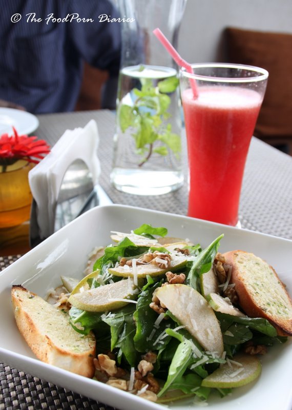 When I see a Pear and Arugula Salad on a restaurant menu, it has to be had. This one was going to be shared, but nevertheless! Crisp Arugula leaves peppered with slices of pear and generous shavings of Parmesan were dressed in a light lemon dressing and tossed with walnuts. They serve it with a side of garlic bread and this could easily become a light lunch on those diet days.