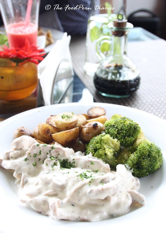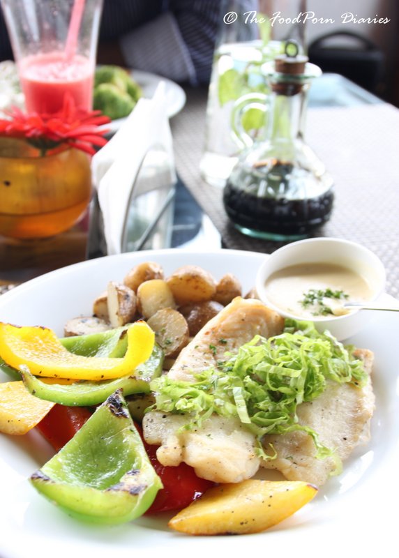 The husband chose to have Grilled Fish. After a lot of deliberation, he chose the Pangasius Filet ‘Dijon style’. Pangasius is nothing but Basa, though the menu lists both the names in two different entrees. When questioned, the waiter told us the Pangasius was imported while the Basa was local. Go figure. The grilled fish was served with a side of roasted peppers and baby potatoes. The Dijon mustard-white wine sauce was served separately and made a lovely addition to the grilled fish.
