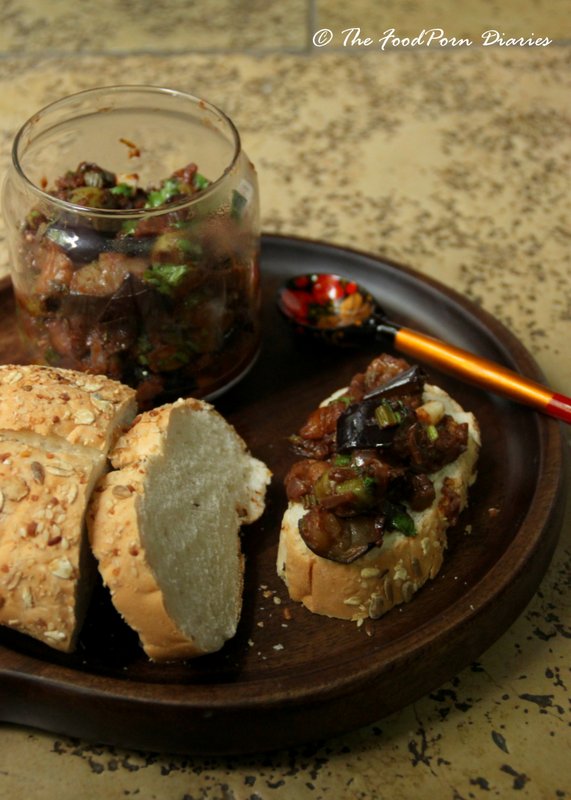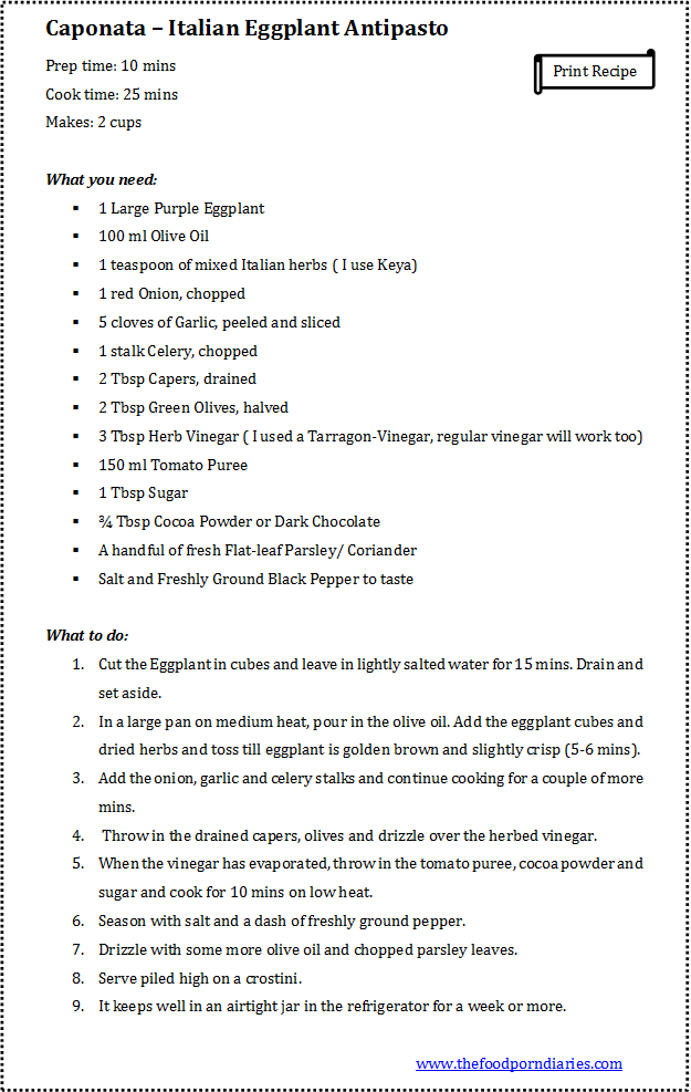 I stumbled upon this gem of an antipasto, serendipitously. I had a large purple Eggplant at home that begged to be made into something other than a Baingan Barta and three Italian cookbooks that lay invitingly next to the kitchen table. Random scans of the index revealed ‘Caponata’ under the Eggplant category. Jamie Oliver’s book – Jamie’s Italy, had a rustic looking stew that begged for some bread to dip into its bucolic goodness. And then I came upon Ritu Dalmia’s book that advocated spiking Caponata with some chocolate! And finally, my trusted Inner Circle Family Cookbook had a picture of the Caponata, glistening with olive oil and green olives, piled high over crostini. Naturally, I had to make it.