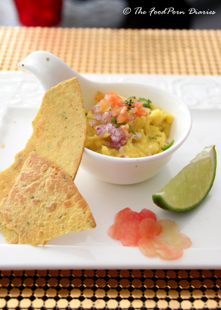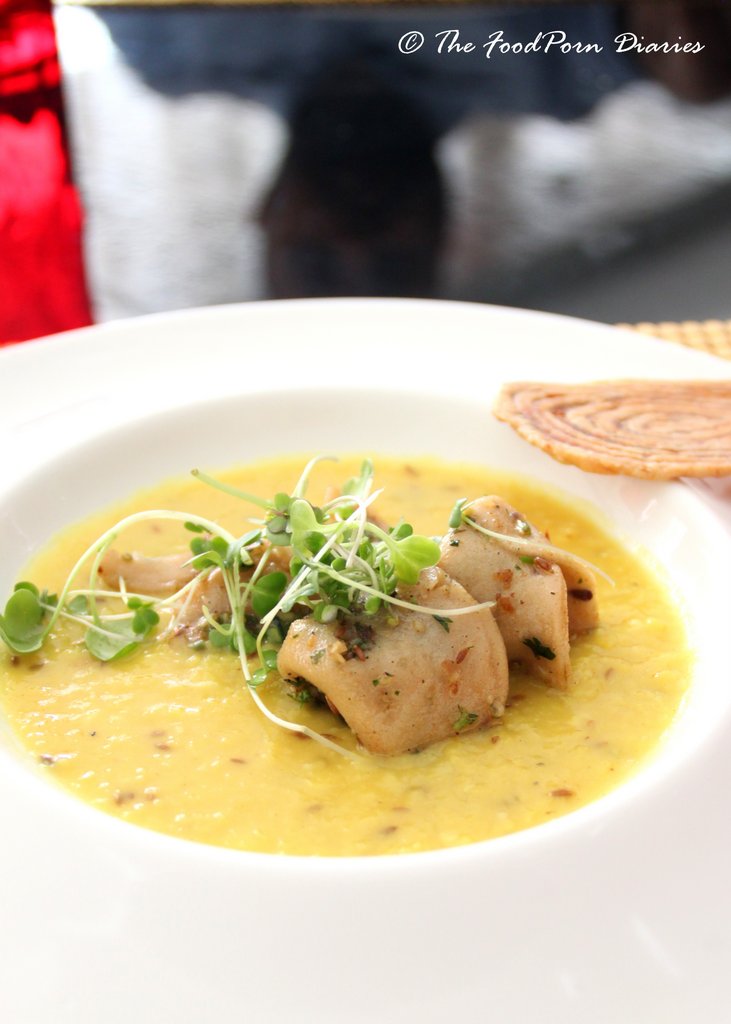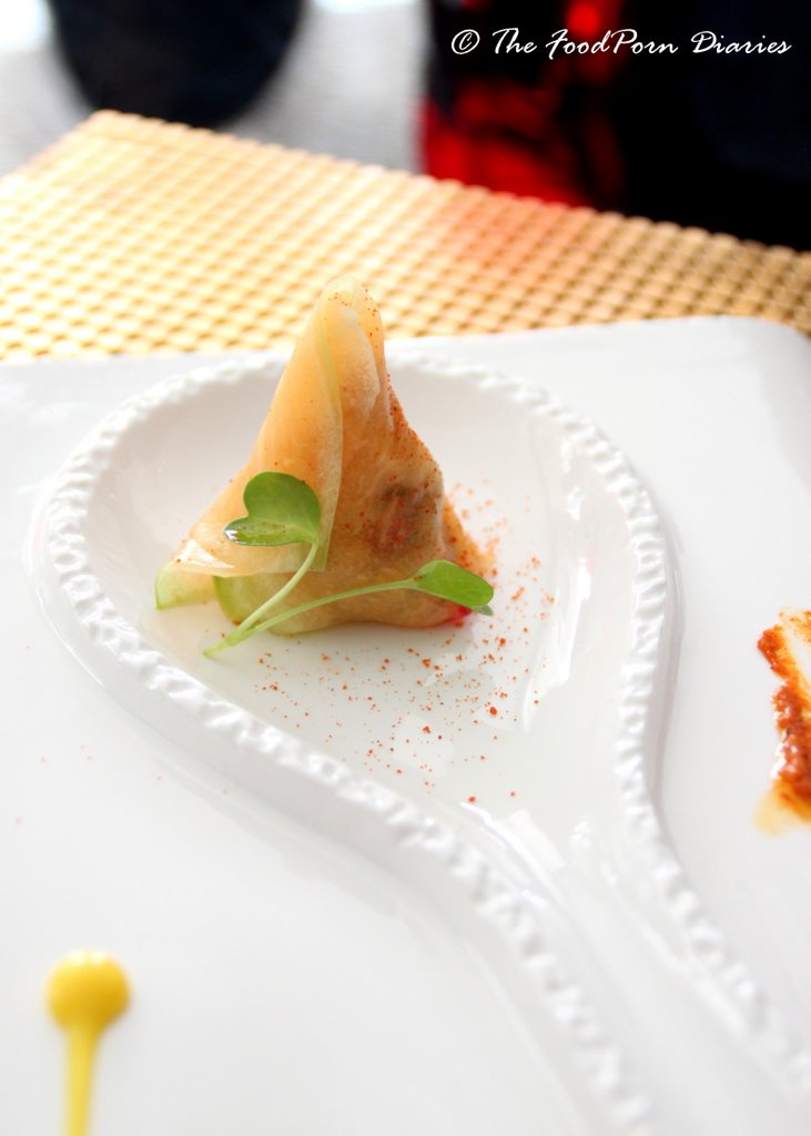 In this entire degustation journey of hits, misses, excesses and maybes, one dish stood out for me. The Bihari Pithi Pockets – completely rustic in its origins but given a simple modern twist. Traditionally, Pithi is a paste made of besan, turmeric and rose water, humbly rolled into dumplings. Here it is fashioned into little tortellini like shells filled with spinach, cottage cheese and flax seeds. Customarily eaten with a cumin specked dal, the same is used as a sauce in this rendition. A Bakharwadi roll gives the rich dish a crunchy interlude and the chewy sweet Aam Papdi breaks up the creamy monotony of the dal.