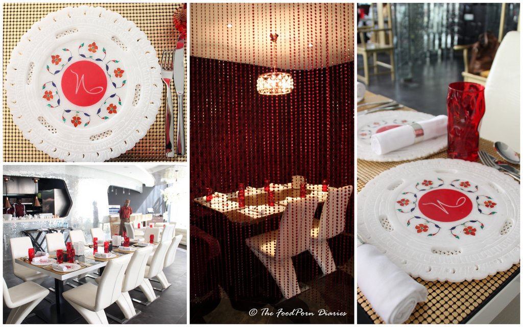 After a not so cryptic guessing game (like aspect cuisine), if you shake off the mysterious ‘erie’, you will realize that in Nimisserie, the Naanerie is the place where Naans come from. (Think Bacon Naan, Apricot Chilli Naan and Chicken Manchurian Naan served in mini wheelbarrows). What needs some digestion however, is the same tedious play on the words Kebaberie and Tawakerie. The latter being similar to a Teppanyaki where the chefs will customize your dish according to your preferences and serve the same in a live counter set up. Chef uses some interesting alterations to a standard tandoor and salamander to achieve melt in the mouth grills and breads. The second floor also has private dining spaces segregated from the main area using a glitzy red bauble curtain.