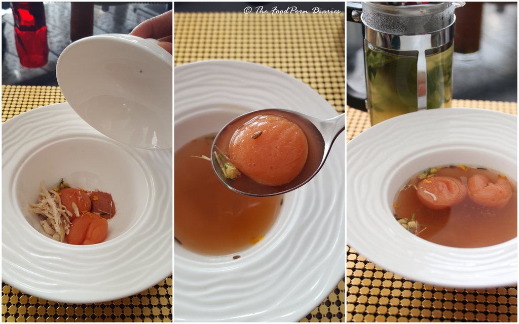 Or the soup course which arrives in two parts – the consomme in a Coffee Press and the rest of the players, including a spongy floating globe that once was a tomato along with flower petals and caraway seeds waiting to be resurrected in a shallow white bowl. There is much fanfare attached to EVERYTHING and while the final effect is a pleasant mouthful, I can’t fathom how necessary ALL the elements are.