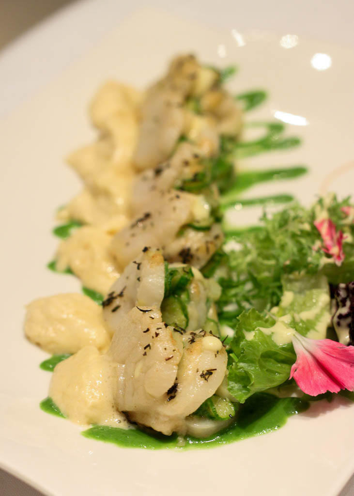 Another stunning entrée was the Millefoglie di asparagi e capesante – thyme scented asparagus interspersed with perfectly cooked scallop discs. Seafood and Asparagus complement each other charmingly with their mild flavors and delicate composition.