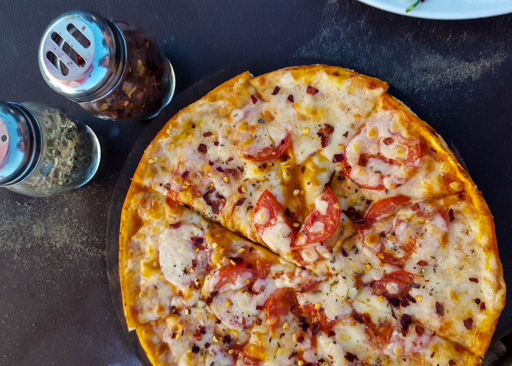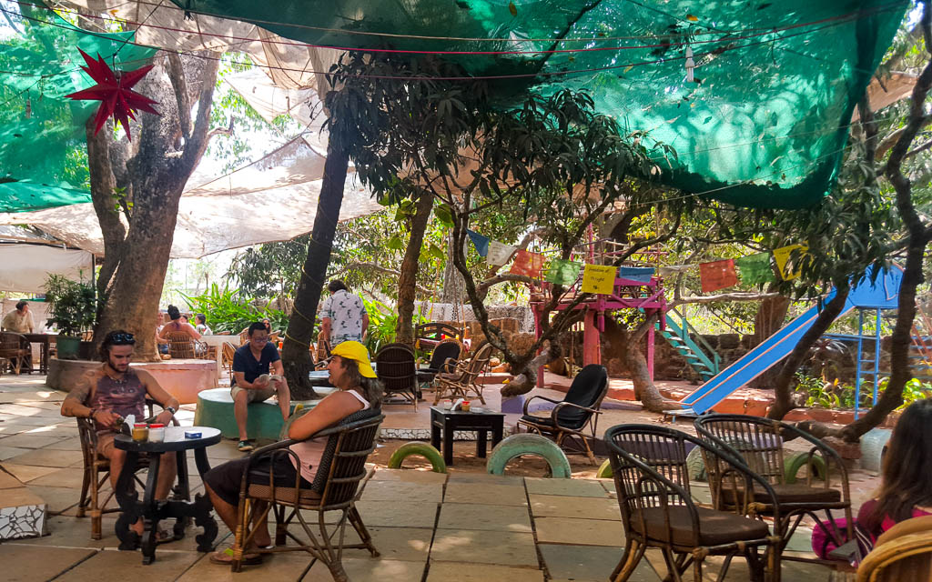 I’m not kidding when I say this cafe is hidden from prying eyes. Winding roads that almost seem like they will lead to a dead-end, finally arrive at the laterite entrance of this hippe haven. The place looks like a forest cafe with vines twirling around the low cement seats, the central seating area enlivened with colourful cloth banners and a charming statue of Lord Shiva in a meditative pose. The focus here is on health food and you will find the menu dotted with quirky options. Energy Shots, Kombucha, Salad bowls, Vegan, Macrobiotic and Organic – the place is a manna for the Aquarian age hippe. Try their 6grain or Buckwheat crepes with Feta eggs or their Apple-Cinnamon Pancake with maple Syrup or their Puri Bhaji combo. The Mango French Toast when is season is a delight and their Spinach-Mushroom burger is a revelation. Wash it down with a Soursop leaf Chai or a Red Boom (Mango, papya, Strawberry) and take a nap or sit back and enjoy the trippy music in serene settings. One of my favourite places in Goa, I make it a point to visit it every year.