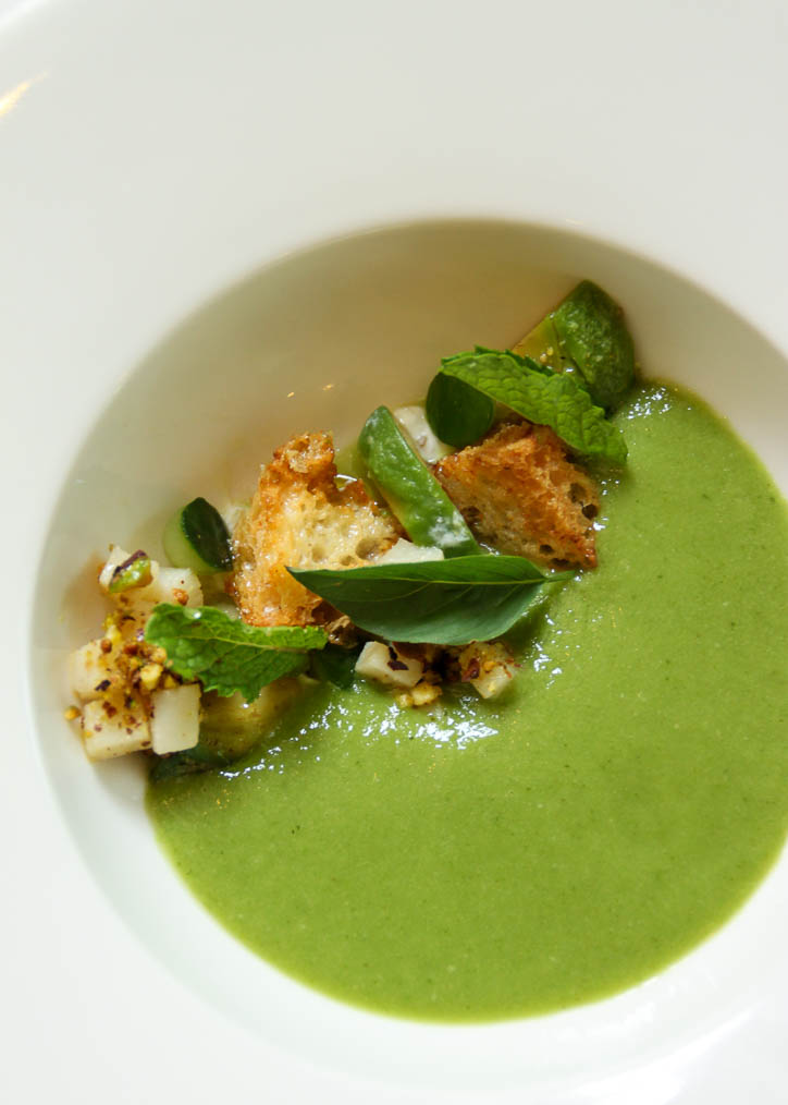 I see scallops on the menu and my resolve dissolves. (Yours’s would too if you saw the elegant plating :p ). Fresh and sprightly mint and cucumber cubes, parmesan croutons and barely cooked scallops created a pretty crescent which was then filled in by a lovely Avocado Gazpacho. There was some ‘frost’ in this as well and it added to the fresh morning-dew feel of the soup. My favourite of the day.