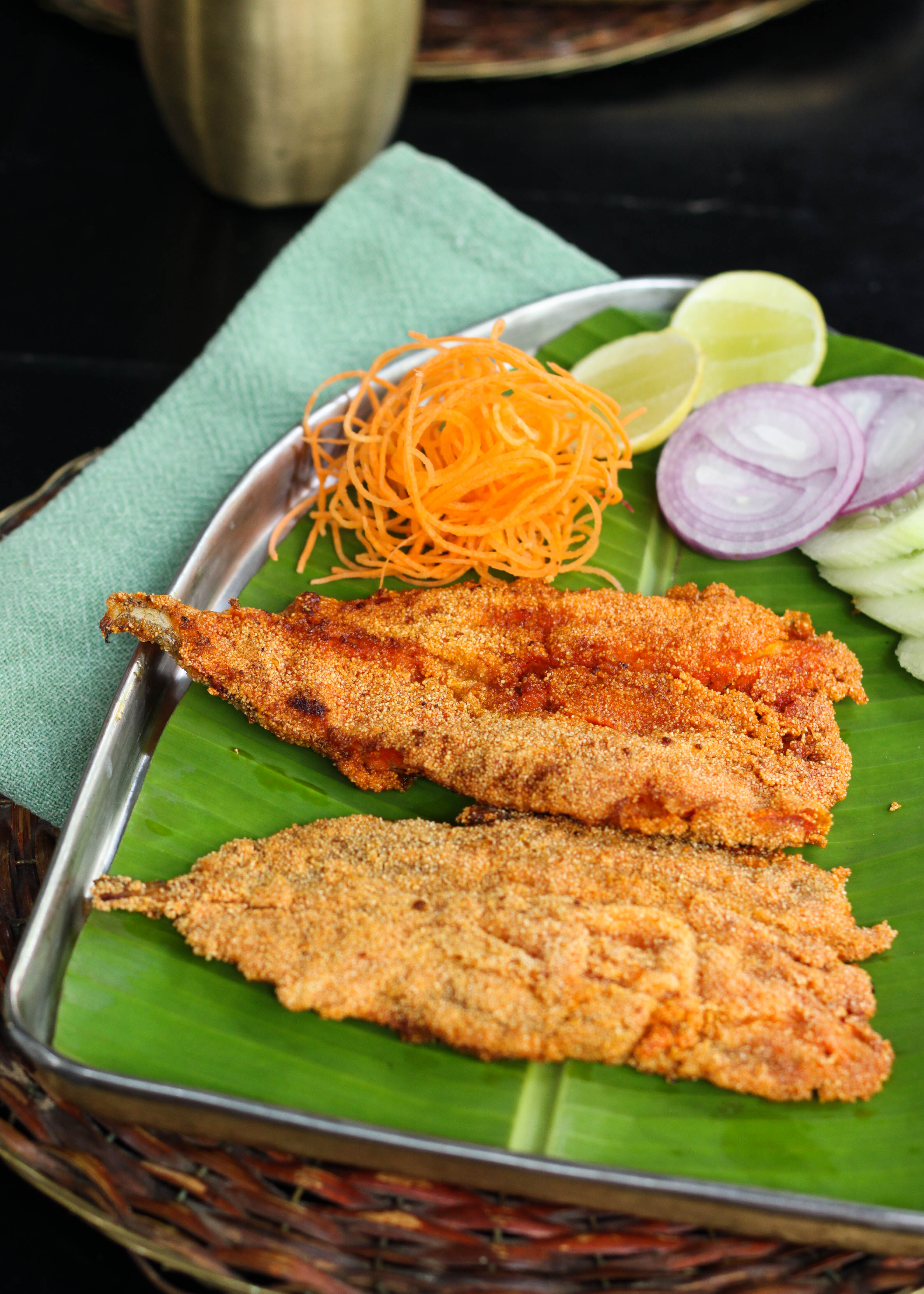 Moving down the western coast to Goa – we tried the King Fish Cafreal. Surmai or King Fish is one of my favourite fishes and it lends itself beautifully to steaks and kebabs. The large King fish steaks were coated with the green chili cafreal paste and an onion mixture and pan fried to perfection. The cafreal gets it’s tangy goodness from the Portuguese influence of adding vinegar to their dishes.