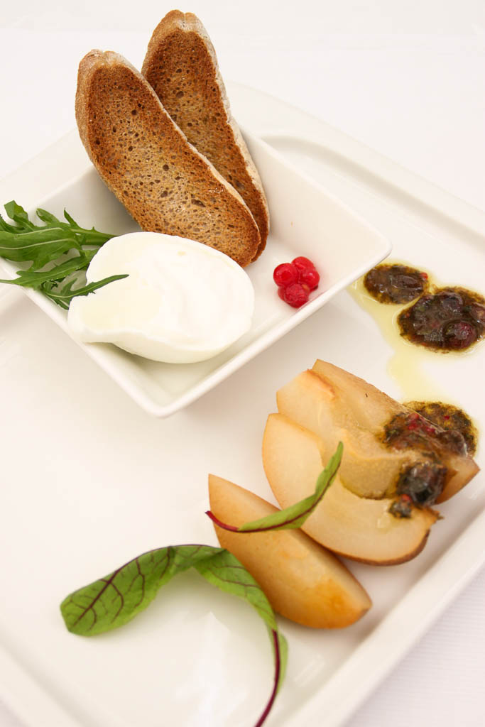 A good Burrata is hard to find in Bangalore. And the really good one made by Father Michael’s Vallambrosa is even harder to find, as it is lapped up by all the 5 star hotels! Raj Pavilion was the culprit here, but I forgive them because of beauty that they sent out to our tables. Half a portion of a creamy Burrata encased in its shell served with Anise Poached Pears. The fragrant pears were dressed with celery pistou and the accompanying ruccola and fresh cranberries made this dish a winner all the way.