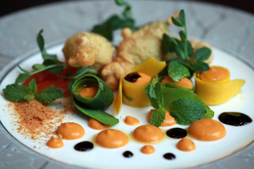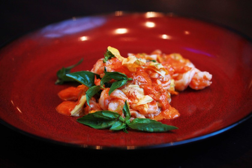Zucchini Flowers are all the rage in Summer and the Antipasti goes the traditional way and serves us Zucchini Flowers stuffed with Ricotta and Smoked Scarmoza. The non-vegetarian version comes stuffed with Seabass, but in this case the smoky scarmoza blew the seabass out of the water. One of my favourite courses for the evening, the zucchini flowers were served with zucchini spirals and a red pepper sauce. Art on a plate and a party in your mouth!
