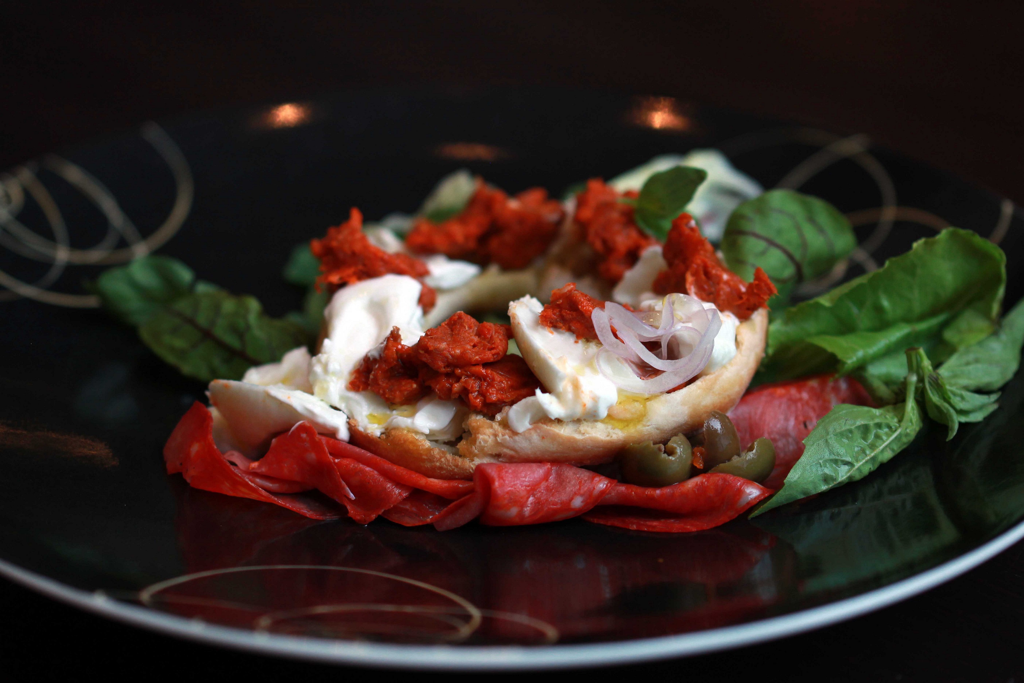 The next antipasti came with a very interesting story. The Friselle looks like a flattened doughnut that has been sitting on the counter too long. If you and I walked by a bakery in Puglia, we would probably ignore this rock hard bread. But that’s because we don’t know what to do with it! The Friselle is a twice baked hardy bread that is meant to last for ages. Fishermen took it with them on long fishing trips as they did not go bad. When it was time to eat, they cleverly soaked them in water (or the stories say seawater) and then piled them high with tomatoes and olive oil. This rock hard bread then transforms into a lovely chewy base with a sweet aftertaste. Ottimo served the Friselle With Heirloom Tomatoes, Cucumber slices and Onions with a drizzle of Puglian EVOO. Definitely a first for me!