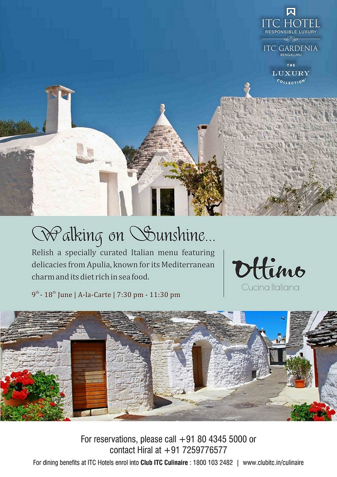 The Apulia festival is on till the 18th of June for dinner at Ottimo. For reservations call +91 80 4345 5000.